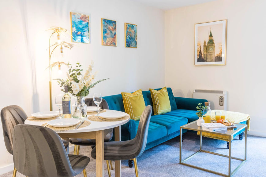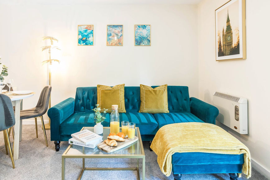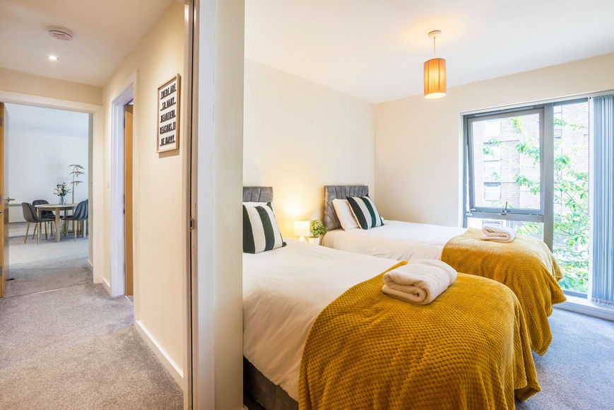 Our Salford Quays stay is a modern 2 bed apartment in Salford near MediaCity, Manchester City Centre and Old Trafford. Sleeps up to 5 guests with flexible zip-link beds that can be arranged as singles or doubles, plus a sofa bed. Ideal for contractors, business travellers and families. Includes secure free parking, fast Wi-Fi, Smart TV and a fully equipped kitchen for comfortable short or longer stays. The space 🛌 Sleeps up to 5 guests with flexible sleeping arrangements 📍 Conveniently located just minutes from Manchester City Centre, MediaCityUK, Spinningfields, and Old Trafford 🚗 Secure off-street parking included at no extra cost 💸 Discounts available for longer stays over 7 days ideal for business trips, relocations, or extended work contracts 🛏️ Sleeping Arrangements Bedroom 1 – Two comfortable single beds Bedroom 2 – Two additional single beds 🛋️ Living Room – Double sofa bed providing extra sleeping space 🍽️ Fully equipped kitchen Includes hob, oven, microwave, fridge/freezer, kettle, toaster, and all essential cooking utensils. 🛋️ Comfortable living area Relax in a bright lounge with a Smart TV including Netflix, YouTube and streaming apps. 📶 Fast Wi-Fi – Perfect for work, video calls, or entertainment. 🧼 Fresh towels and bed linen provided 👕 Washing machine and dryer available 🧺 Iron and ironing board provided 🌡️ Heating for year-round comfort Guest access 🔑 Guests have full private access to the entire apartment, with no shared spaces. 🚗 Secure off-street parking is included at no additional cost. 🛒 Self check-in via a coded lock. Other things to note 🚭 Smoking is not permitted inside the apartment 🎉 No parties or loud gatherings, as this is a quiet residential building 🧽 Optional cleaning can be arranged for longer stays on request 📦 The apartment is located on the 2nd floor and accessed by stairs only 🕒 Flexible check-in and check-out may be available depending on availability